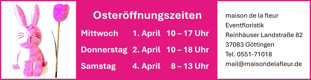 Aufträge und Anfragen für Beratungstermine nehmen wir gerne per E-Mail mail@maisondelafleur.de oder Telefon 0551/71018 an. Persönlich sind wir am Donnerstag von 15 - 18 Uhr für Euch da.